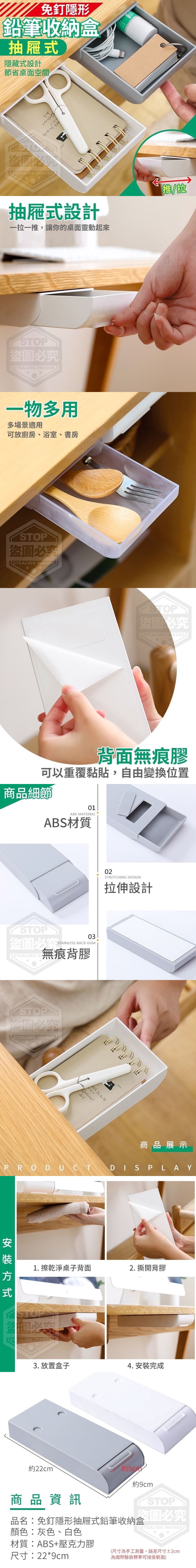 免釘隱形抽屜式鉛筆收納盒 批發:35元 【商品尺寸】22*9cm (尺寸為手工測量,誤差尺寸±2cm為國際驗貨標準可接受範圍) 【商品材質】-ABS+壓克力膠 【商品說明】- 隱藏式設計,節省桌面空間,一物多用 收納筆、尺、圓規、紙巾、剪刀、手機 等物件,抽屜式設計,一拉一推,讓你 的桌面靈動起來,背面無痕膠,可以重 覆黏貼,自由變換位置~