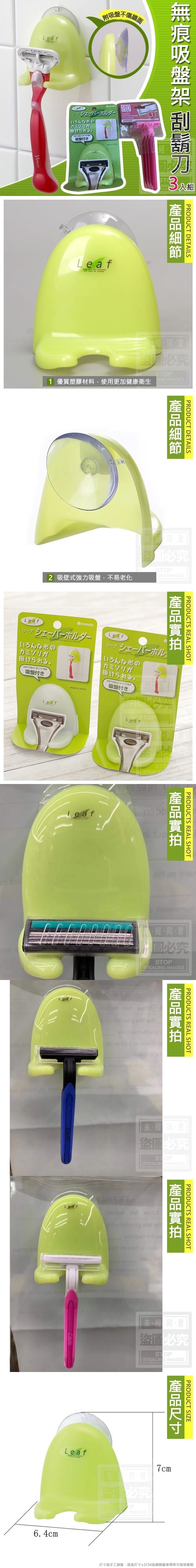 外銷尾單 無痕吸盤架刮鬍刀3入組 切貨:一組30元 【商品尺寸】- 6.4X7CM (尺寸為手工測量,誤差尺寸±2cm為國際驗貨標準可接受範圍) (附贈配件款式數量及顏色隨機出貨,圖片僅供參考,以實際收到為主。) 【商品說明】- 優質塑膠材料讓使用健康衛生 穩固塑膠材質經久耐用 附吸盤不破壞牆面即可安裝 放自己好拿取的牆面位置即可 簡約造型設計為實用而生的刮鬍刀架 搭配三入組刮鬍刀一起購買超值划算!!