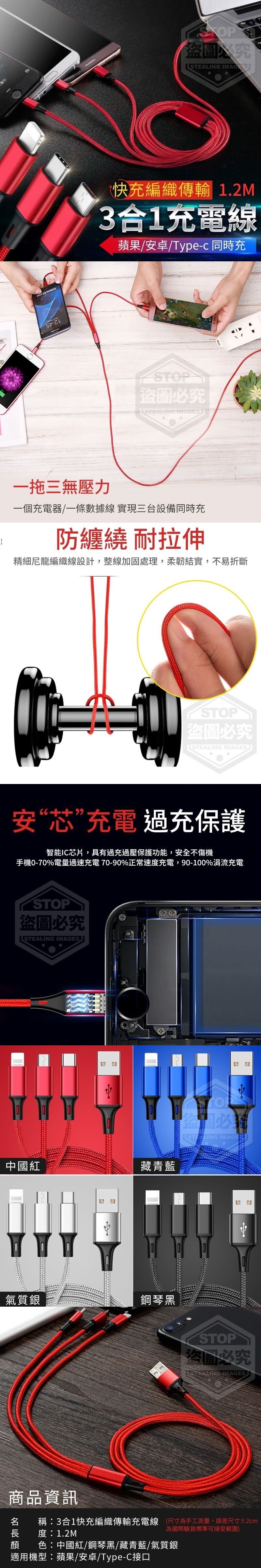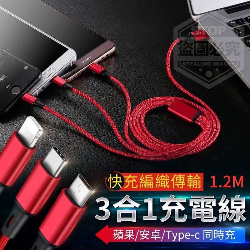 3合1快充編織傳輸充電線2.1a 隨機 批發:38元/條 【商品尺寸】1.2M (尺寸為手工測量,誤差尺寸±2cm為國際驗貨標準可接受範圍) 【商品說明】- 適用蘋果/安卓/TYPE-C三種類型接 口同時充,智能IC芯片,具有過充 過壓保護功能,安全不傷機,精細 尼龍編織線設計,整線加固處理, 柔韌結實,不易折斷,一拖三充電 無壓力,告別單一充電~