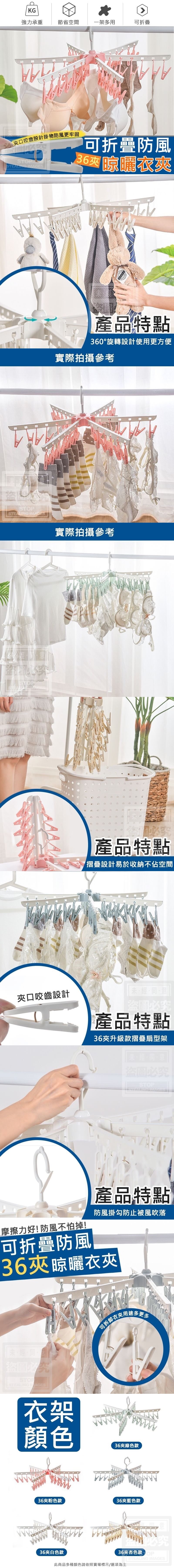 可折疊防風36夾晾曬衣夾 批發:45元 /個 【商品尺寸】- 24X62CM (尺寸為手工測量,誤差尺寸±2cm為國際驗貨標準可接受範圍) (附贈配件款式數量及顏色隨機出貨,圖片僅供參考,以實際收到為主。) 【商品說明】- 晾曬好幫手~36夾大量曬衣更方便 收納設計不佔空間 防風掉落曬衣夾&360度可旋轉掛勾 摩擦力好不怕防風掉落 可拆卸一夾用途多更多! 衣架多用超划算~~~