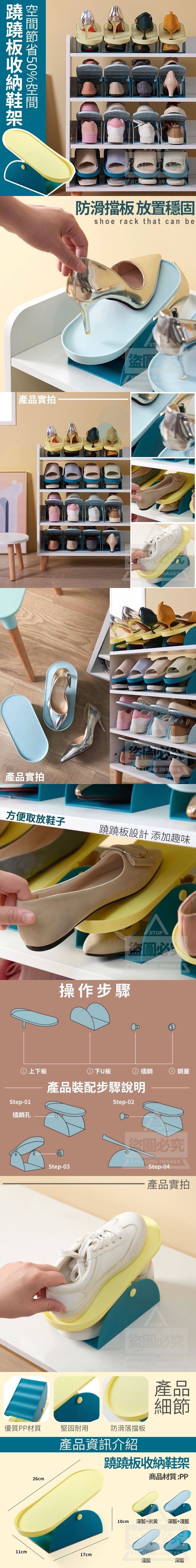 北歐系列蹺蹺板收納鞋架(4入/套) 批發:一套125元 【商品尺寸】26x11x10 cm (尺寸為手工測量,誤差尺寸±2cm為國際驗貨標準可接受範圍) 【商品說明】 運動鞋、皮鞋、高跟鞋...鞋子愈買愈多,又雜又亂塞不下嗎? 推薦您雙層收納鞋架,立即創造50%收納空間,再也沒有裝不下的問題! 防止鞋子滑落,下層鏤空設計,通風透氣,多變空間呵護您的愛鞋!