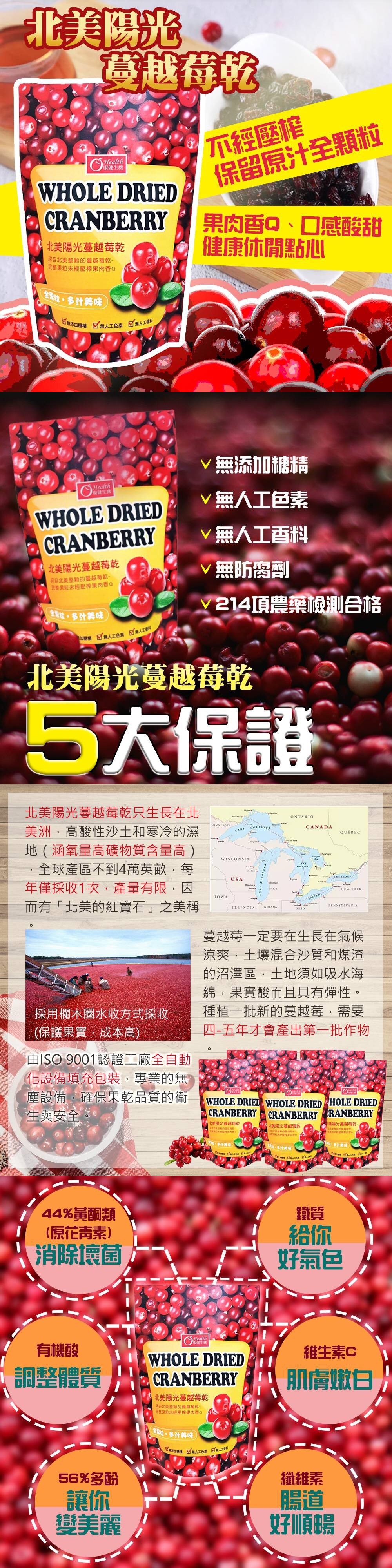 北美陽光蔓越莓乾只生長在北美洲,高酸性沙土和寒冷的濕地(涵氧量高礦物質含量高),全球產區不到4萬英畝,每年僅採收1次,產量有限,因而有「北美的紅寶石」之美稱。