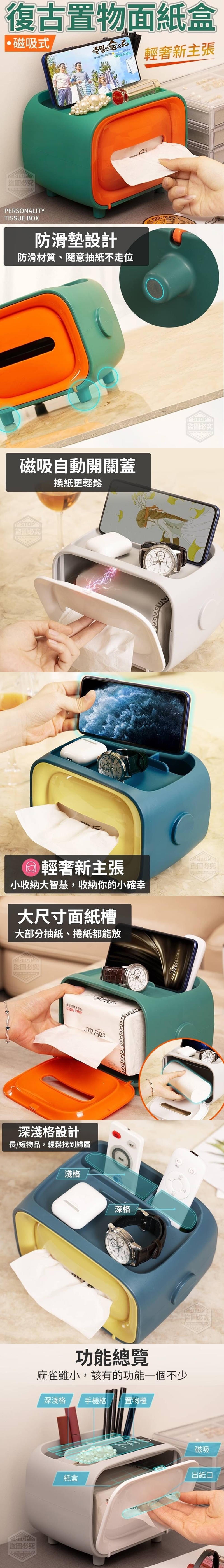 【商品說明】- 麻雀雖小,該有的功能一個不少 大尺寸面紙槽,大部份抽紙、捲紙都能放! 磁吸自動開關蓋換紙更輕鬆~ 深淺格設計,長/短物品輕鬆找到歸屬 小收納大智慧,收納你的小確幸~ ★磁吸式換紙方便 ★手機架功能,讓你追劇解放雙手 ★加大出紙口,不在卡卡! 防滑墊設計,防滑材質、隨意抽紙不走位 外觀時尚好看,客廳、餐廳、浴室、臥室 放哪都好看!你的居家收納輕奢新主張!!