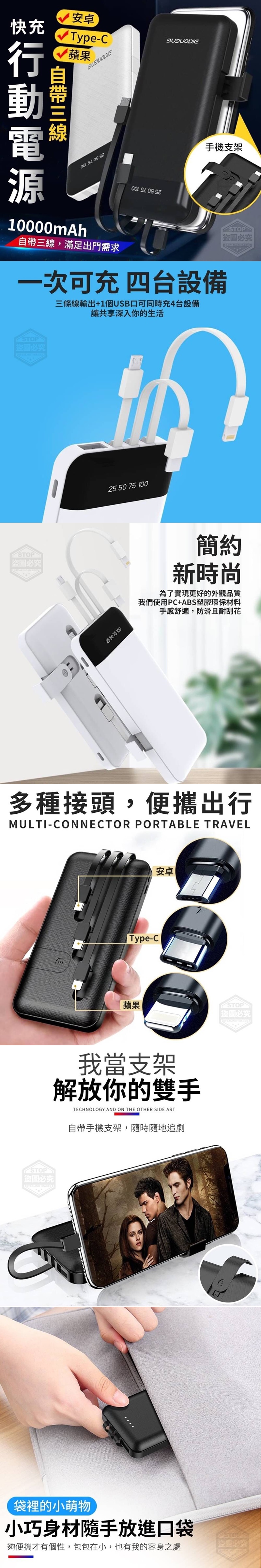 【商品說明】-足8000mAh 一次可充四台設備,出門不用帶線 自帶Micro+Type-C+蘋果三種線加1個USB口 可實現同時充4台設備,讓共享深入你的生活 小巧身材隨手放進口袋,夠便攜才有個性 包包在小,也有我的容身之處,自帶手機支架 隨時隨地追劇,解放你的雙手~