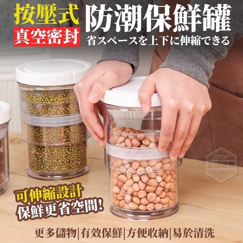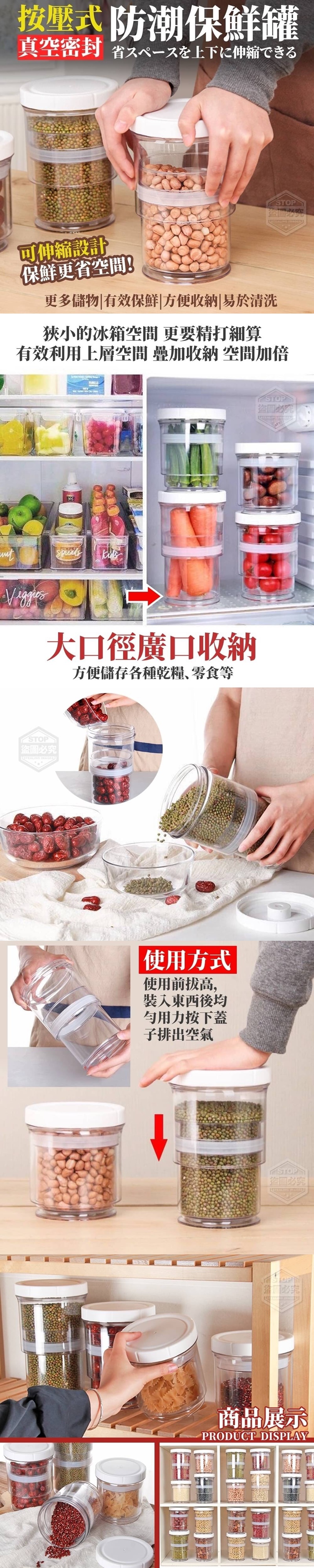 【商品說明】- 容量600-1400ml 每次逛完超市,採買好多食物回家儲存 但只要打開之後沒有吃完、用完 放久就會受潮或著變質,就不新鮮了! 這樣真的讓人很困擾啊!!! 而放進冰箱又怕冰箱太多東西串味... 這時候保鮮密封罐就很重要了! 這款按壓式真空密封防潮保鮮罐 可根據您的需求按壓收縮 可伸縮設計保鮮更省空間 不僅僅是防止食物受潮 還有效利用了收納空間 輕鬆搞定食材收納,保鮮不易變質 可疊加,櫃子空間不浪費 每個家庭都要必備這款保鮮罐唷 ✓更多儲物 ✓有效保鮮 ✓方便收納 ✓易於清洗