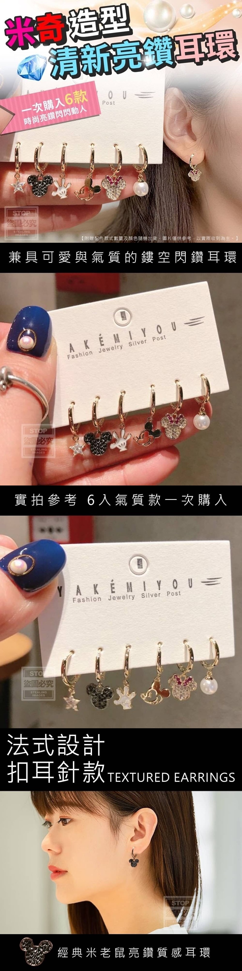 (附贈配件款式數量及顏色隨機出貨, 圖片僅供參考,以實際收到為主。) 【商品說明】- 經典造型米奇米妮氣質閃鑽造型耳環 一次購入6個 超可愛的耳環 每天換一款 天天都有好心情 法式甜美的設計風格 簡約百搭鏤空簡約造型 猶如天使般的美麗光澤 趕快為自己或閨蜜一人買一套吧 送人自用都超划算