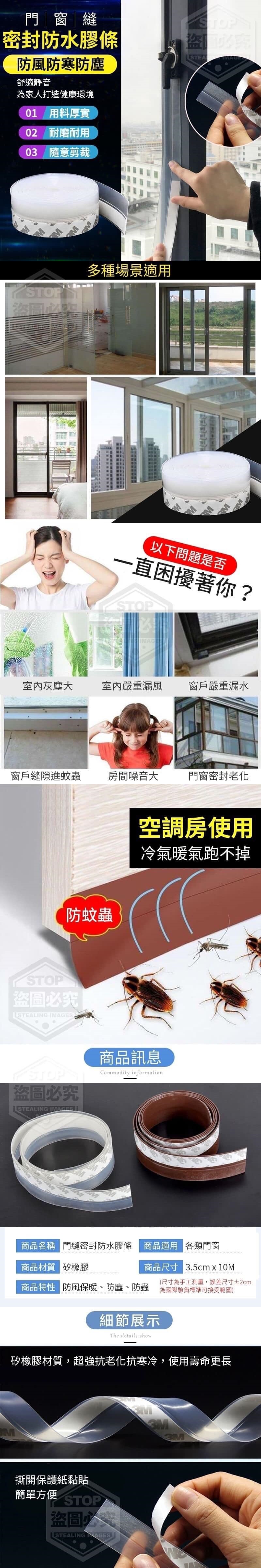 【商品材質】-矽橡膠 【商品尺寸】3.5cm*10M (尺寸為手工測量,誤差尺寸±2cm 為國際驗貨標準可接受範圍) 【商品說明】- 貼上門窗縫上可防風、防寒、防塵 、防蟲,撕開保護紙即可黏貼,簡 單方便,矽橡膠材質,超強抗老化 抗寒冷,使用壽命更長,空調房使 用,冷氣暖氣跑不掉,舒適靜音為 家人打造健康環境~