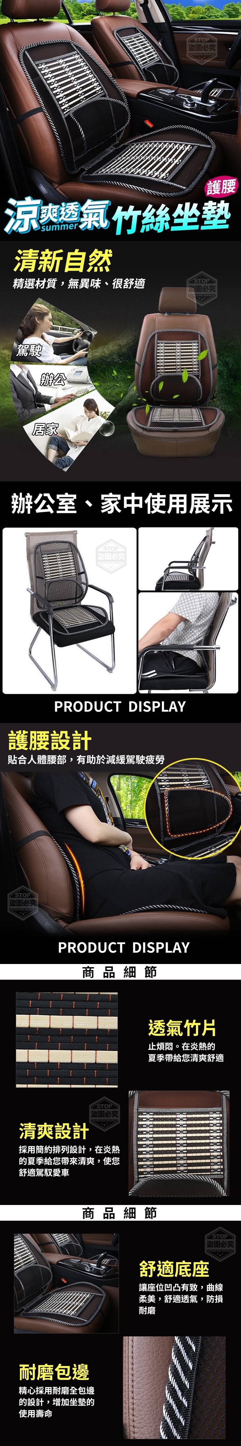 【商品說明】- 每次坐在車上都有悶熱感 讓我們的小PP也涼爽一夏吧!!! 涼爽透氣竹絲坐墊 採用透氣的竹片止煩悶。 在炎熱的夏季帶給您清爽舒適~ 精選材質,無異味、很舒適 採用簡約排列設計 在炎熱的夏季給您帶來清爽 舒適底座凹凸有致 曲線柔美,舒適透氣,防損耐磨 護腰設計貼合人體腰部 有助於減緩駕駛疲勞讓您舒適駕馭愛車! ‧舒適 ‧透氣 ‧清涼 ‧耐磨 一墊多用,涼感持久 居家、汽車、辦公的好搭檔 消暑降溫還能給予腰部足夠的支撐唷!