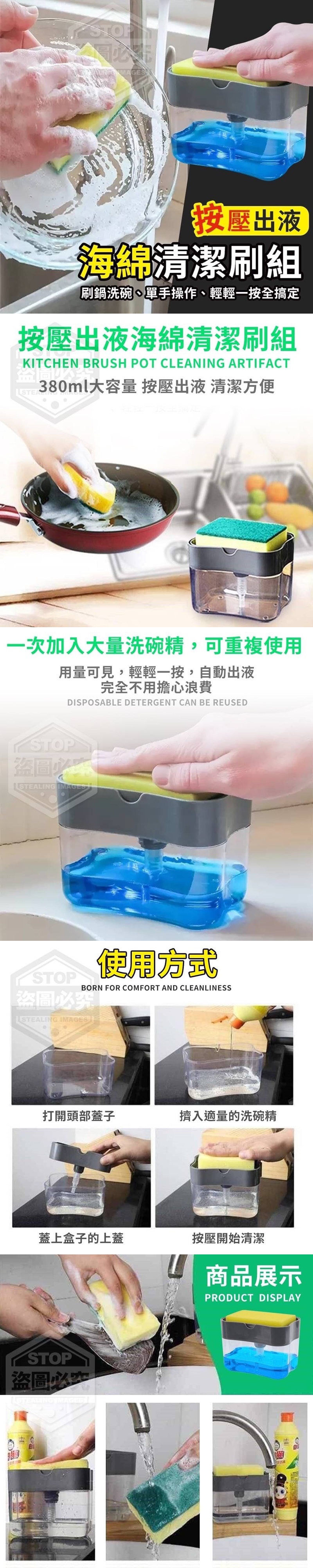 【商品容量】380ml 【商品說明】- 按壓出液海綿清潔刷組,380ml大容量 用量可見,輕輕一按,自動出液 完全不用擔心浪費,一次加入大量洗碗精 清潔方便告別繁瑣,刷鍋洗碗也能很輕鬆 單手操作、輕鬆搞定廚房清潔!