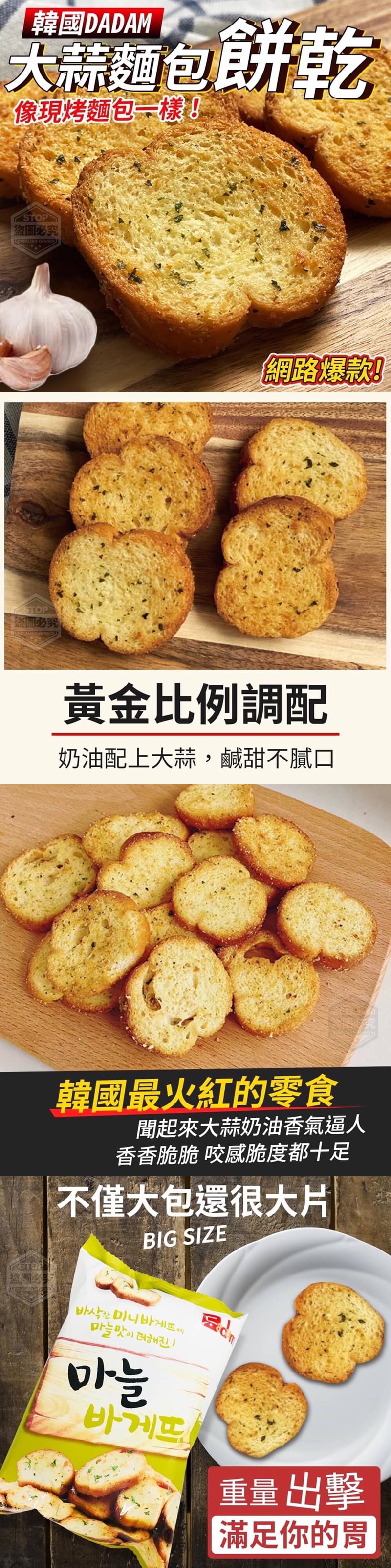 【商品規格】- 重量:100公克 產地:韓國 保存期限:12個月 保存方式:常溫 【商品說明】- 追劇、聚會、放鬆必備點心 韓國最火紅的零食 滿滿的份量CP值超高 黃金比例調配,奶油配上大蒜 鹹甜不膩口、酥脆香濃! 聞起來大蒜奶油香氣逼人 香香脆脆,咬感脆度都十足 厚片烘烤、金黃色色澤 像現烤麵包一樣好吃! 鹹鹹甜甜好吃超涮嘴 不僅大包還很大片,就是要滿足你的胃唷~ 保證擄獲你的芳心 大人小孩都愛 出門旅遊的好夥伴 免出國 韓國餅乾衝一波