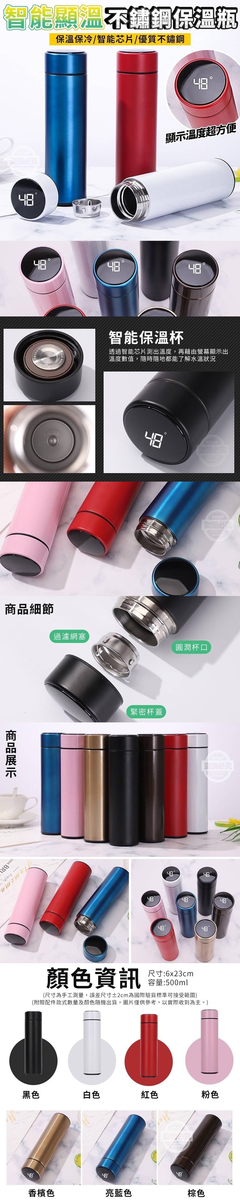 【商品材質】-不鏽鋼 【商品尺寸】-6x23cm (尺寸為手工測量,誤差尺寸±2cm 為國際驗貨標準可接受範圍) (附贈配件款式數量及顏色隨機出貨, 圖片僅供參考,以實際收到為主。) 【商品說明】- 這是一款搭戴高科技的保溫杯 透過智能芯片測出溫度 藉由螢幕顯示出溫度數 讓你隨時隨地都能了解水溫狀況 也可以用來泡小寶寶的牛奶喔 使用不鏽鋼材質打造 堅固耐用、無異味、好清洗 還有過瀘網塞可以讓你泡茶喝喔! 一個小小的瓶身集於多項優點 這款保溫杯真的是太優秀了!!! 多色任你選擇喔!