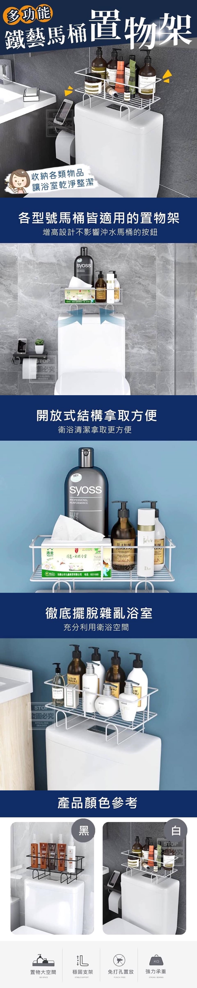 (附贈配件款式數量及顏色隨機出貨, 圖片僅供參考,以實際收到為主。) 【商品說明】- 馬桶上的空間也能再使用喔 除了單擺衛生紙 搭配置物架你可以放更多! 收納各類物品讓浴室乾淨整齊 適合各類型號馬桶皆適用的置物架 增高設計不影響沖水馬桶的按鈕 開放式結構拿取也很方便 充分利用衛浴空間 整齊又好拿取的多功能置物架