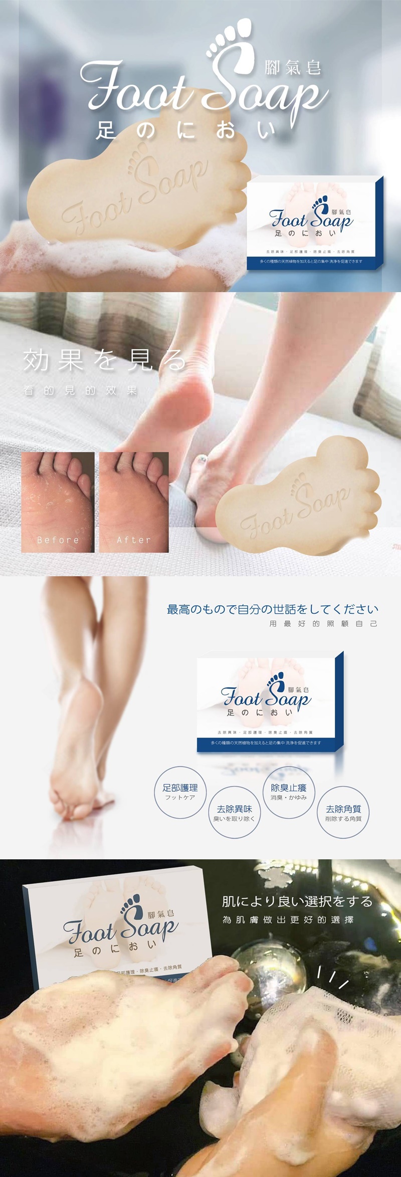 搭外銷產線 文案不建議公開使用 日本熱銷款 夏天悶熱,腳底悶在鞋內,濕熱容易長黴菌 香港腳問題接踵而來 一顆腳氣皂,解決萬般難受的困擾: 超級厲害,爺爺爸爸哥哥弟弟都要來一顆 也可以給媽媽姊妹去腳部角質 解決腳部搔癢問題 舒緩腳部的真菌造成的脫皮 去壞死腳皮,使腳丫皮膚光滑如初 採用專利技術的除臭香精,除去難聞的腳臭味 平日也可以當保養使用,去角質效果佳 茉莉綠茶香-採用專利技術的除臭香精 專利號:WO2008/155683 品牌:日本 產地:台灣代工 容量:90g