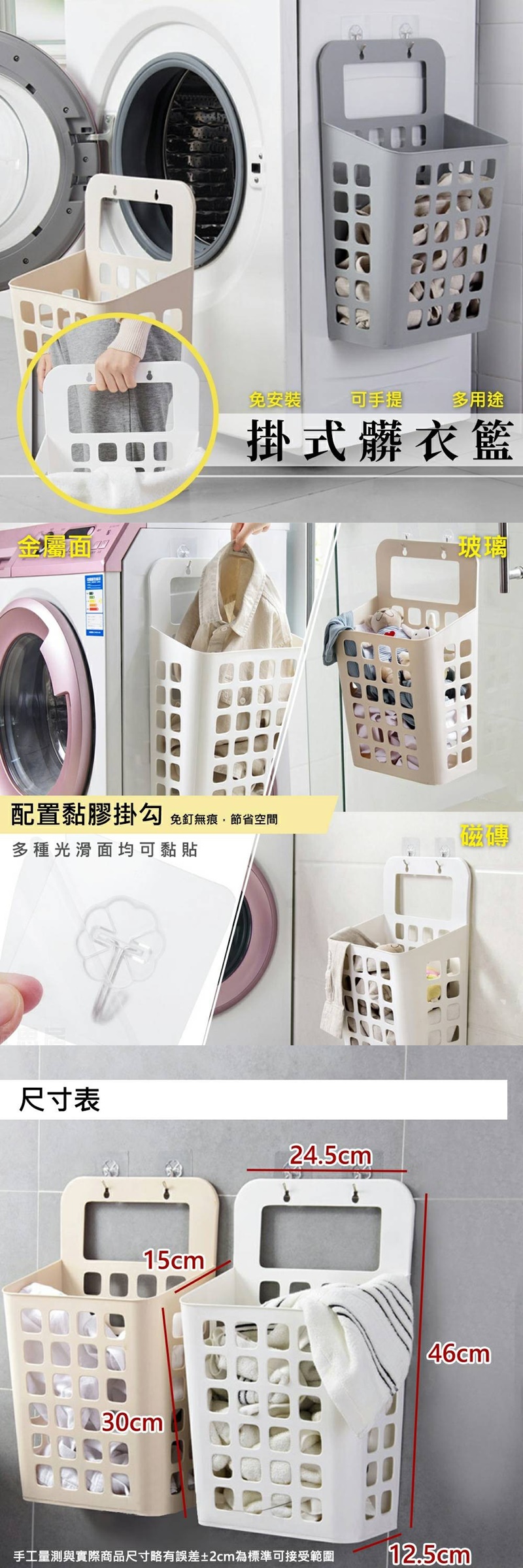 掛式髒衣籃,免釘安裝 壁掛式設計讓你節省空間 輕鬆收納需要換洗的衣物 手提把設計方便好移位 也可以當作多用途收納籃 收納書籍、玩具、蔬菜水果、雜物等等 輕鬆解決難搞的收納問題喔! 網狀設計讓髒衣不悶臭 搭配的雙掛勾可黏貼至各種光滑面 像是金屬、玻璃、磁磚等等 簡約素面的設計非常耐看 不破壞原來的居家裝潢喔! 尺寸:24.5*12.5*30cm(含提把46cm)