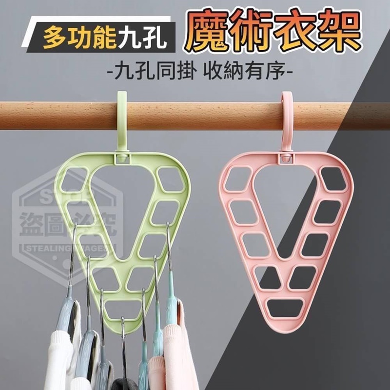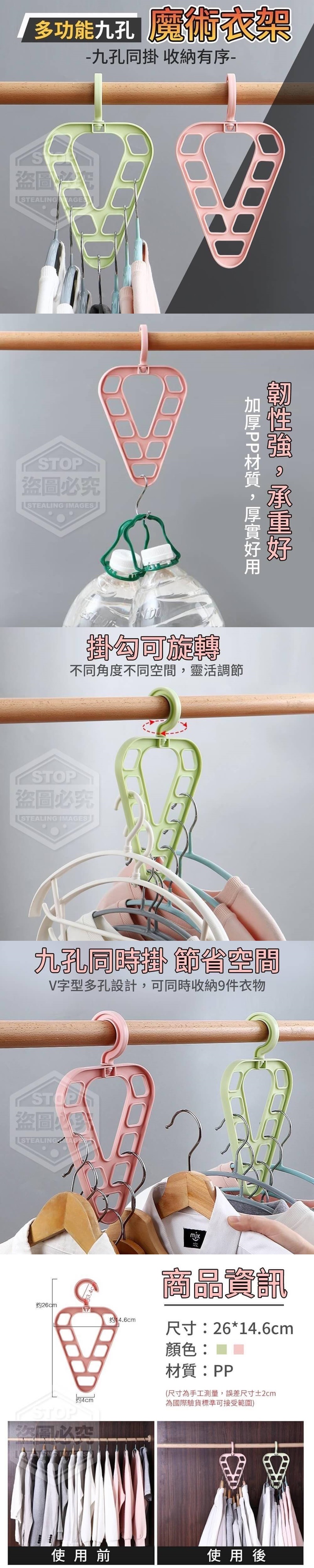 【商品材質】-PP 【商品尺寸】26*14.6cm (尺寸為手工測量,誤差尺寸±2cm 為國際驗貨標準可接受範圍) 【商品說明】- V字型多孔設計,可同時收納9件衣物 ,節省空間掛勾可旋轉,不同角度不 同空間,靈活調節,加厚PP材質,厚 實好用,邊緣加寬設計,方便掛置, 不易掉落,九孔同掛,衣物收納更輕鬆~