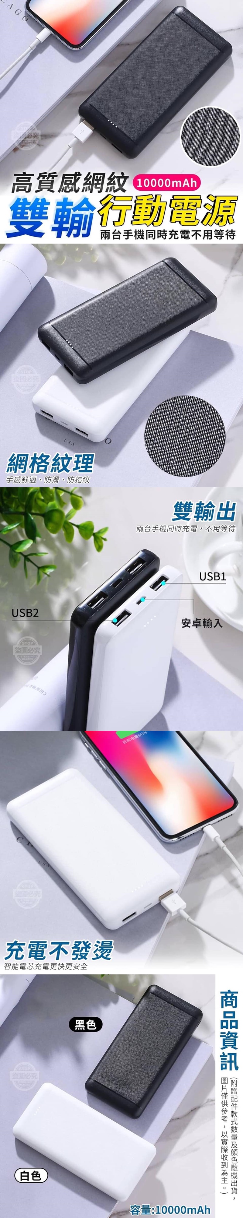 (附贈配件款式數量及顏色隨機出貨, 圖片僅供參考,以實際收到為主。) 【商品說明】- 現代人手機、平板一人就有多台設計 這款雙輸行動電源正好能滿足你 一次充兩台且有擁有10000mAh大容量喔! USB雙介面設計 可以同時充兩台設計,完全不用等待 智能電芯 充電更快且不會發燙,讓你可安全的使用 網格紋理設計 握起來手舒適且防滑、止滑紋也超質感 雙輸出+大容量 外出旅行有這一台就足夠啦!