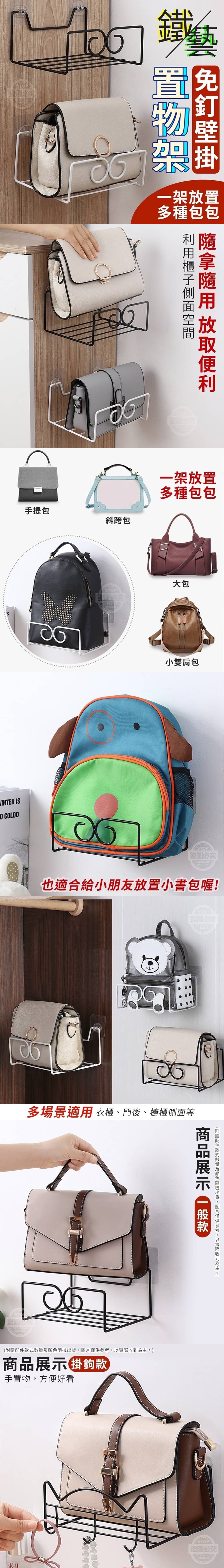【商品說明】- 家中有好多的包包 這麼多的包包卻讓你不知何處放嗎? 鐵藝免釘壁掛置物架 一個置物架,可放不同款式的包包 背包、手提包、斜跨包、側背包等等都可以放 也可以放小孩的小書包喔! 可安裝在牆壁、櫃子的側面、門後 不止可以放包包,更多物品等你來收納! 隨意取放,隨拿隨用,出門拿著走就出門 鐵藝風格設計,裝在家中任何地方都好看