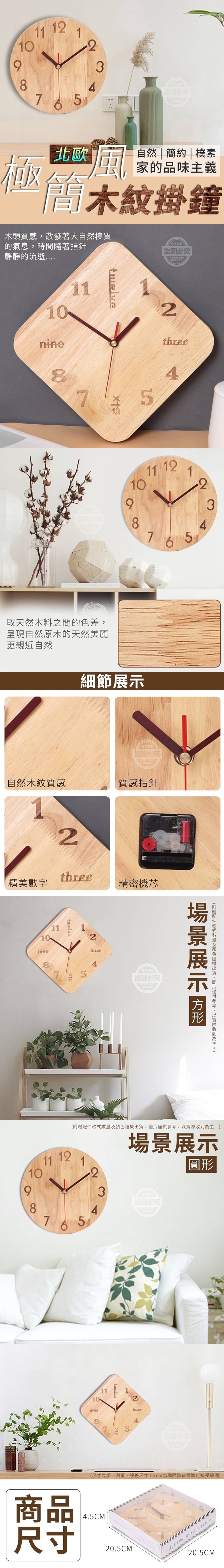 【商品尺寸】-外盒20.5x20.5x4.5cm (尺寸為手工測量,誤差尺寸±2cm 為國際驗貨標準可接受範圍) 【商品款式】-圓形、方形 (附贈配件款式數量及顏色隨機出貨, 圖片僅供參考,以實際收到為主。) 【商品說明】- 北歐極簡風木紋掛鐘 自然、簡約、樸素 取用天然木料之間的色差 呈現自然原木的天然美麗色彩 散發著大自然樸質的氣息 帶給枯燥乏味的家中出現了一些生機 質感指針,簡約大氣 搭配精美木紋數字 讓你靜靜的享受時間的流逝 裝中家中任地方都很好看 輕鬆提升家的品味,靜享生活