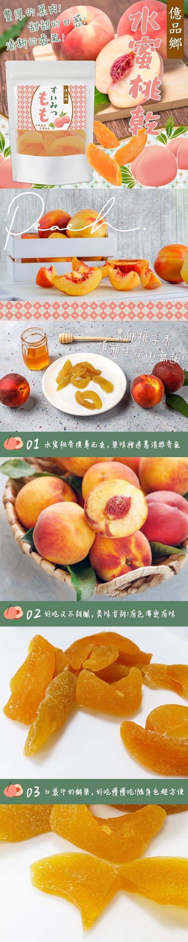 穿梭於果片中的水分! 隨子桃子的香氣融入你的味蕾裡! 覺得生活總是太無趣?? 讓甜甜的水蜜桃乾來填補這些縫隙 由充足陽光+適宜氣候所孕育出來的大鮮桃 桃味更濃郁!恰恰好的甜度、高顏值的果乾 長時間低溫烘培乾燥技術 保留百分百的新鮮原味~100% 口感絕佳讓人唇齒留香~ 一口咬下就能吃出鮮桃味 休閒時光一起來享受水蜜桃乾帶來的幸福感~~ 來源:台灣 內容物:60g±5g*3包 效期:依照包裝上標示