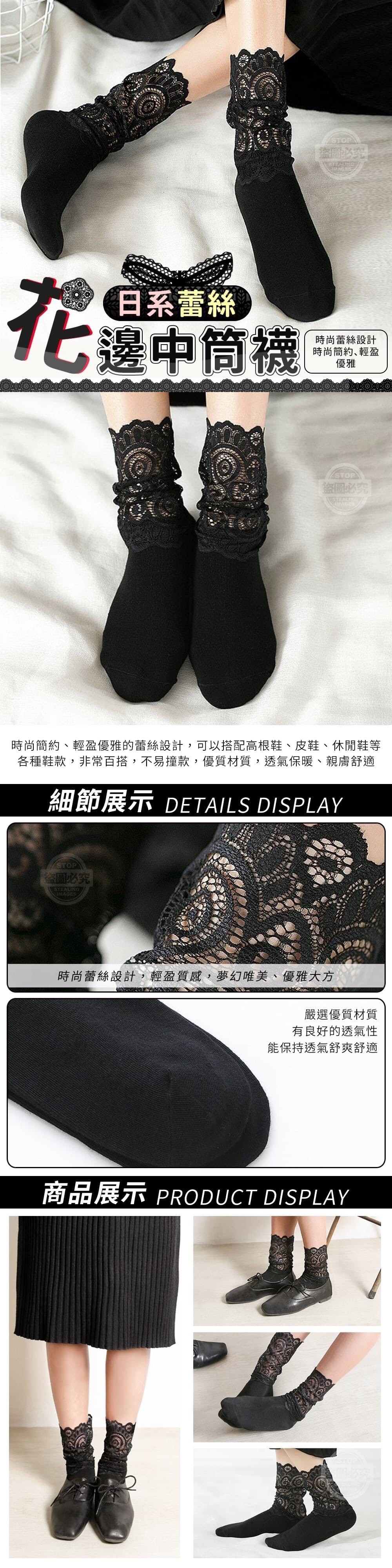 (尺寸為手工測量,誤差尺寸±2cm 為國際驗貨標準可接受範圍) (附贈配件款式數量及顏色隨機出貨, 圖片僅供參考,以實際收到為主。) 【商品說明】- 日系蕾絲花邊中筒襪 秋冬必備透膚短襪 蕾絲花邊造形 輕盈優雅,甜美不失性感 能夠襯托美麗的肌膚 讓女人變得更加嫵媚動人 嚴選優質材質 有良好的透氣性 能保持透氣舒爽 且保暖舒適 可以搭配高根鞋、皮鞋、休閒鞋等各種鞋款 寬鬆好搭超有型~ 輕盈質感、夢幻唯美、優雅大方 是所有女性不可或缺的百搭單品!