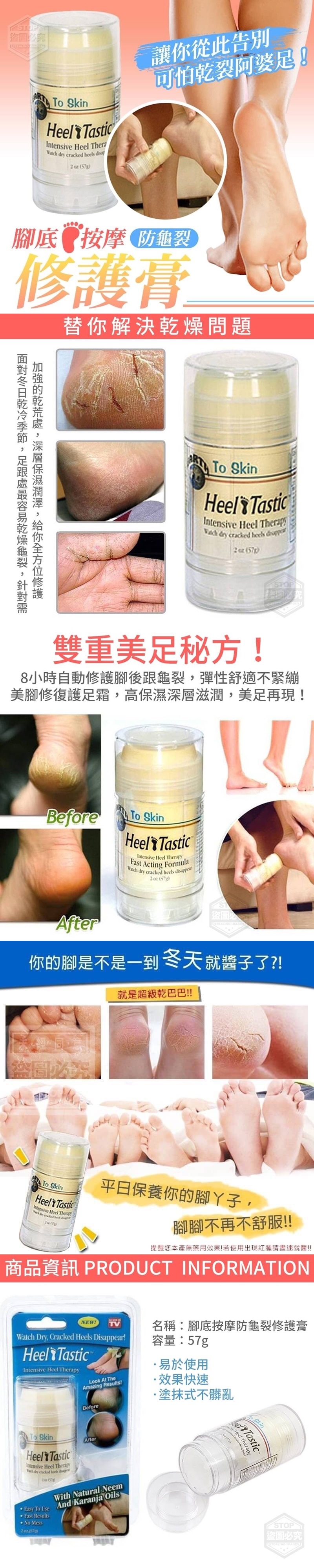 【商品說明】- 快來呵護嫩足一起滑溜溜 面對冬日乾冷季節... 足跟處最容易乾燥龜裂 針對需加強的乾荒處 深層保濕潤澤,給你全方位修護! 讓你從此告別可怕乾裂阿婆足! 雙重美腳秘方!好吸收 8小時自動修護腳後跟龜裂 防龜裂修護膏,攜帶方便 高保濕深層滋潤,美足再現! ●只需8小時,自動修護腳後跟龜裂 ●滋潤乾燥肌膚,拒絕乾癢 ●嫩足養成!你也能擁有名模般美足 ●軟化老繭防腳裂,具保濕效果,再現水潤肌膚