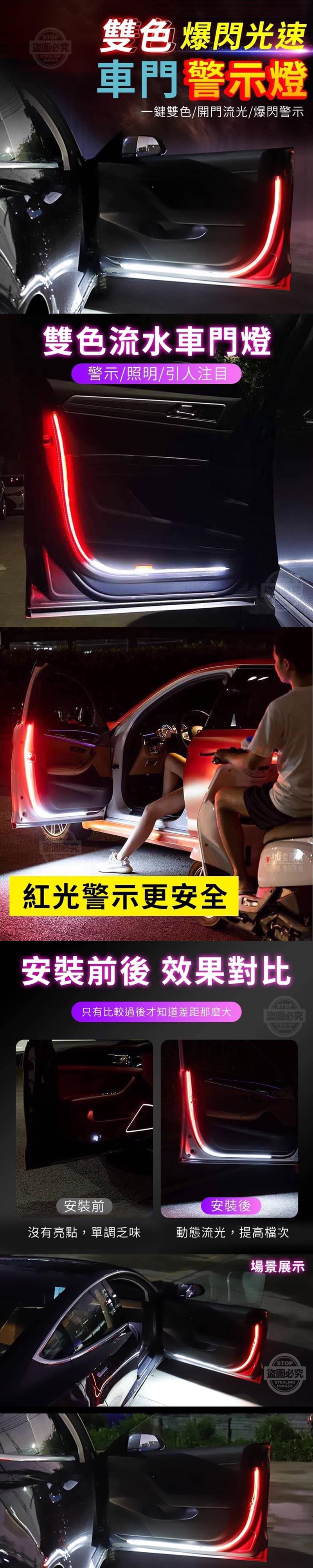 (尺寸為手工測量,誤差尺寸±2cm 為國際驗貨標準可接受範圍) (附贈配件款式數量及顏色隨機出貨, 圖片僅供參考,以實際收到為主。) 【商品說明】- 晚上黑漆漆 打開車門如果後方來車沒注意到 可能會有撞傷事故的發生.... 裝上這一款雙色爆閃光速車門警示燈吧! 裝在車門上再加上紅白雙色的動態流光 明亮又顯眼 對後方的來車有非常明顯的警示作用喔! 即便在黑夜中 也不用擔心後方來車看不見你而發生撞傷的意外 裝上雙色爆閃光速車門警示燈 不只顧及你的安全也顧及全家人的安全