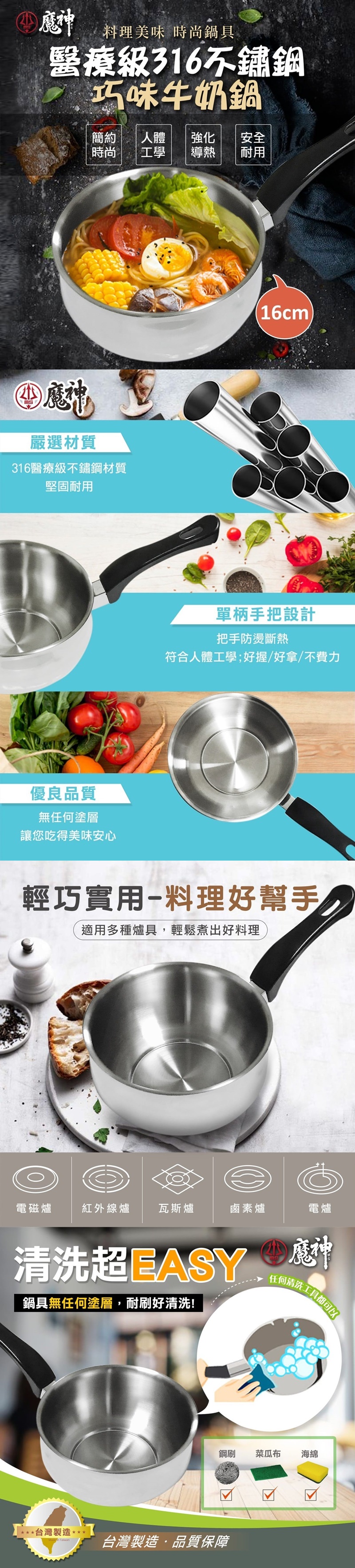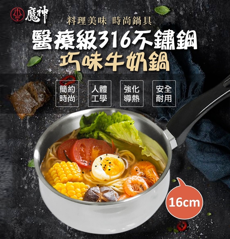 推薦給您這款無敵好煮的316不鏽鋼巧味牛奶鍋 百貨公司狂賣衝破一萬支!!!! 尾單放福利囉!!! 輕巧可愛,大小剛剛好, 家庭烹飪一把罩媽媽們的小幫手 醫療級316不鏽鋼材質, 堅固耐用,不生鏽,好清洗 耐熱電木把手無鉚釘設計蒸煮過程安全隔熱, 好握不燙手 瓦斯爐、電磁爐、電熱爐都適用 規格:16cm 產地:台灣
