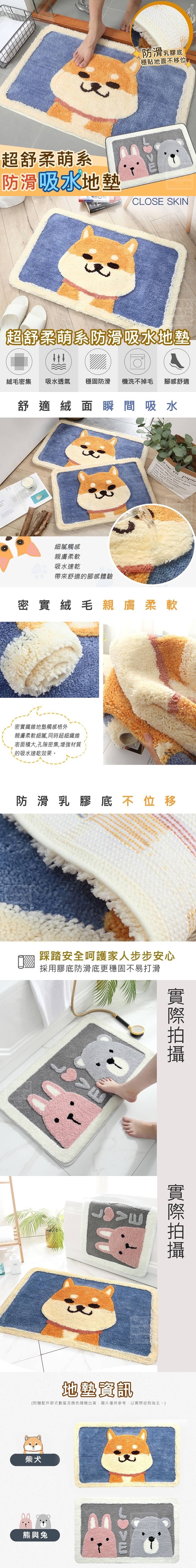 尺寸40x60cm 【商品款式】-柴犬、熊與兔 (附贈配件款式數量及顏色隨機出貨, 圖片僅供參考,以實際收到為主。) 【商品說明】- 俏皮萌趣風格讓可愛度再飆高 不管擺在哪都好看! 可以放置在門口浴室臥房玄關等 出入口除塵吸水 輕鬆保持室內地面整潔 乳膠底部防滑佳 密實絨毛吸水力好 踩踏親膚柔軟細膩 不易掉毛、起球、外型美 吸水性好、一觸即乾、更快乾 背面防滑設計可牢牢抓住地面不傷地面! 選一款好的地墊很重要 兩種款式任你挑選喜愛圖案!