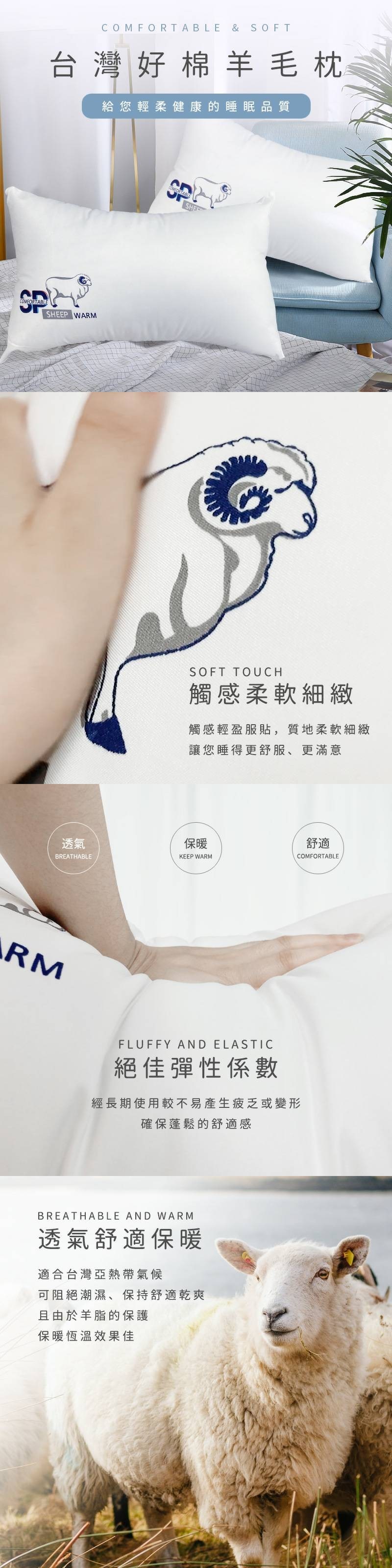 睡眠品質好 健康沒煩惱 你如果是對枕頭很有要求的人 那麼選這顆就對了 來自高檔做工 非常飽滿厚實的枕頭 良好的睡眠與枕頭息息相關 台灣好棉羊毛枕 讓您擁有舒適睡眠 透氣舒適保暖 適合台灣亞熱帶氣候 可阻絕潮濕、保持舒適乾爽 且由於羊脂的保護 保暖恆溫效果佳 絕佳彈性係數 經長期使用較不易產生疲乏或變形 確保蓬鬆的舒適感 觸感柔軟細緻 觸感輕盈服貼,質地柔軟細緻 讓您睡得更舒服、更滿意 台灣精製 清洗方式: 可手洗水洗,曝曬晾乾,不建議機洗