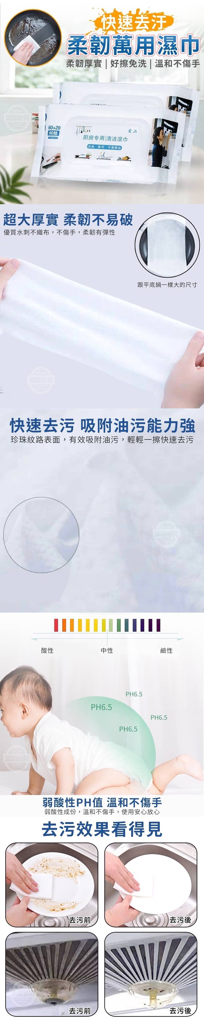 【商品說明】- 還在用滿滿化學藥劑清洗你的餐具嗎? 洗過的碗盤可能還有化學藥劑殘留 你的雙手也因為長期觸碰有害的洗潔精 導致皮膚變得過敏 用用看這款快速去汙柔韌萬用濕巾吧! 弱酸性PH值,溫和不傷手,讓你使用安心 使用優質水刺不織布製成 柔韌厚有彈性,不易破裂 品質有保證CP值超讚~ 而且擁有跟平底鍋聘美的超大尺寸 完全讓你看得見的真材實料 珍珠紋路表面,有效吸附油污 輕輕一擦就能快速去除油污 擦過的地方下一秒變得亮晶晶 除油去污不髒手 是所有媽媽必備的清潔好幫手