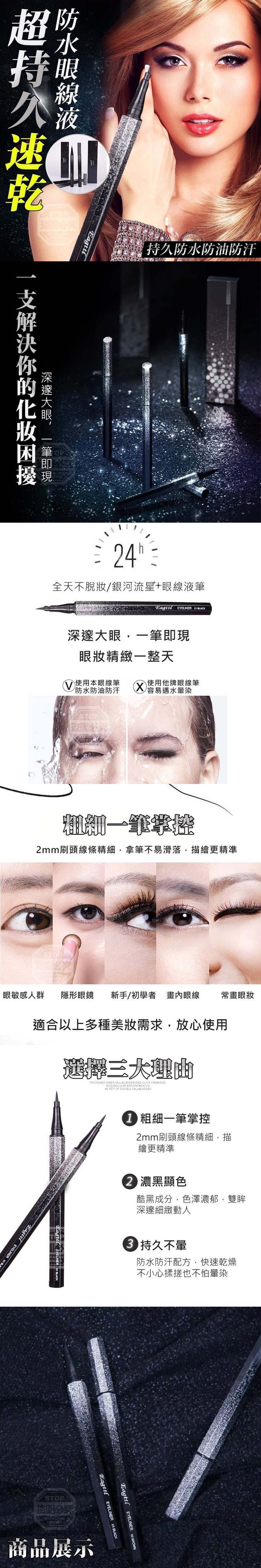 【商品說明】- 一支解決你的化妝困擾 深邃大眼,一筆即現 持久防水防油防汗 一秒速乾,全天不暈染不脫妝 眼線不防水/筆觸不滑順/眼皮易出油 易暈染?/傷眼肌?/易脫妝? 採用彈性刷頭 專業眼線筆,專為女人打造,彈韌舒適 顏色飽滿 妝容隨心所繪 好用星空外觀 讓你使用他更有好心情