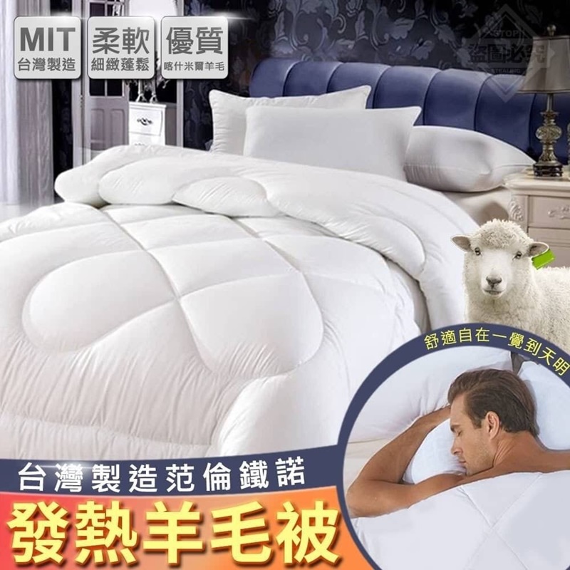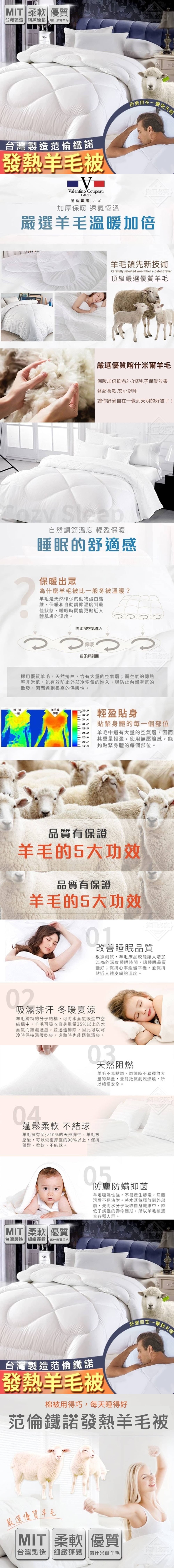 台灣製造范倫鐵諾發熱羊毛被【商品材質】-表布:100%聚酯纖維、填充物:20%羊毛、10%發熱纖維、20%銀離子、50%聚酯纖維【商品尺寸】-6*7呎(180*210cm)(尺寸為手工測量,誤差尺寸±2cm為國際驗貨標準可接受範圍)【商品重量】-1.6kg±5%【商品說明】-氣溫急速轉涼 日夜溫差大來一條蓬鬆溫暖羊毛被就像在飯店級享受一樣蓬鬆不厚重擺脫千斤頂蓄熱鎖住最舒適的被窩溫度嚴選優質喀什米爾羊毛保暖加倍抵過2~3條毯子保暖效果讓你舒適自在一覺到天明的好被子!柔軟細緻蓬鬆,不怕擠壓變形舒適親膚精選面料好品質!羊毛5大功效●改善睡眠品質●吸濕排汗,冬暖夏涼●防塵防螨抑菌●天然阻燃●蓬鬆柔軟,不結球MIT台灣製造給全家人舒適好睡眠