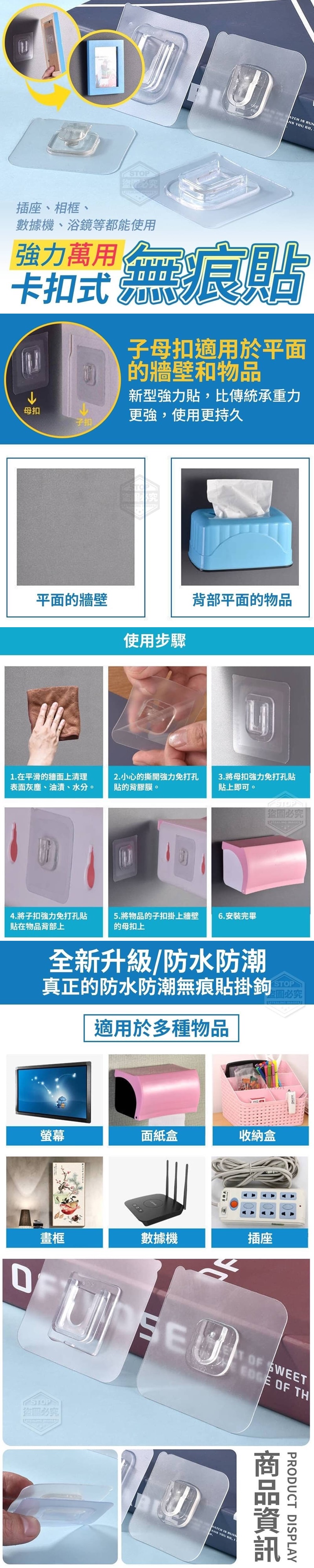 【商品說明】- 最強居家收納神物 安拆便利,撕貼不留痕跡 無痕子母扣,一貼就能掛上 適用於平面的牆壁和物品 採用新型強力貼,比傳統承重力更強 使用更持久,材質防水防潮 插座、相框、數據機、浴鏡等都能使用! 安裝簡單無須打孔~ 輕鬆讓居家更加美觀整潔 無需打孔,易安裝,承重強 防水防潮,最適合浴室廚房使用 這麼萬用,想壁掛什麼就壁掛 免鑽牆面就是它大特點 跟鑽牆say NO 隨處黏貼 免鑽孔 居家廚房、浴室、辦公室、倉庫、 民宿、營業場所皆適用。