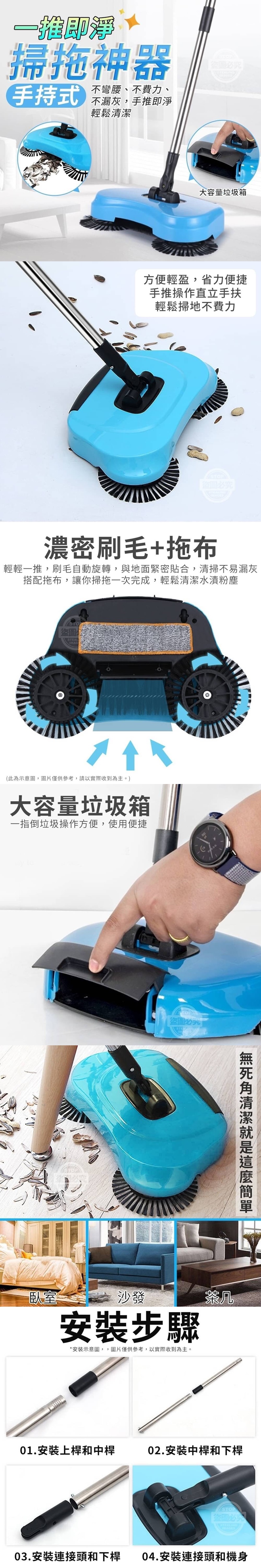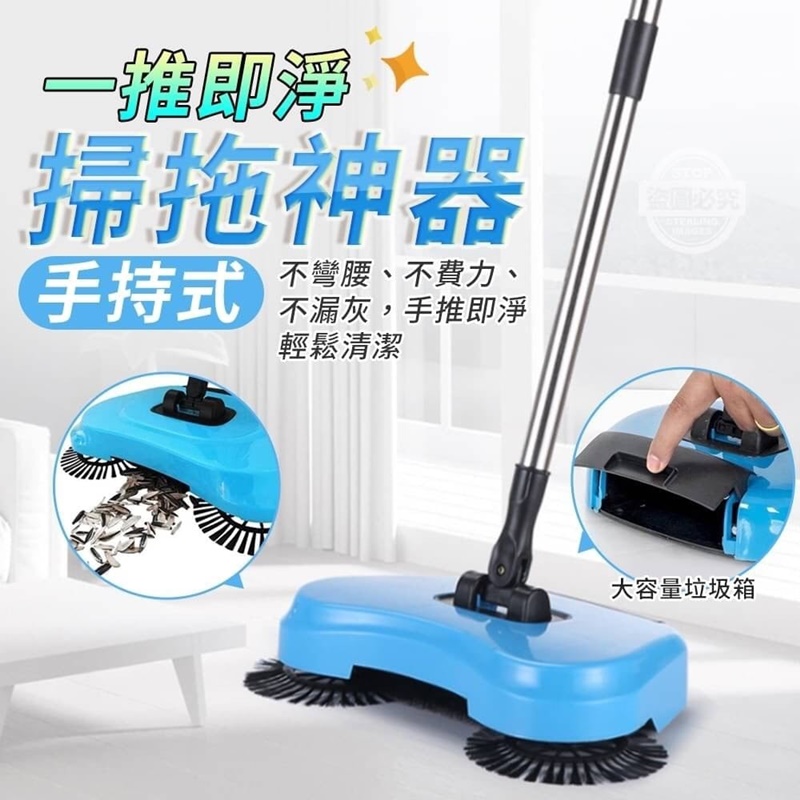 (附贈配件款式數量及顏色隨機出貨, 圖片僅供參考,以實際收到為主。) 【商品說明】- 一推即淨手持式掃拖神器 掃拖一體式設計 輕輕一堆,刷毛自動旋轉 將垃圾、灰塵直接掃進 內置的大垃圾箱裡面 搭配拖布,連拖地也一次完成 長桿設計,方便清潔 讓你不彎腰、不費力 手推操作就能輕鬆將水漬、粉塵清乾淨 大容量垃圾箱 只用一指就能將蓋子打開 方你將垃圾倒出來 使用方便又簡單 臥室、承發、茶几 任何地方便能使用 就連難清理的縫隙 也能清鬆去除乾淨