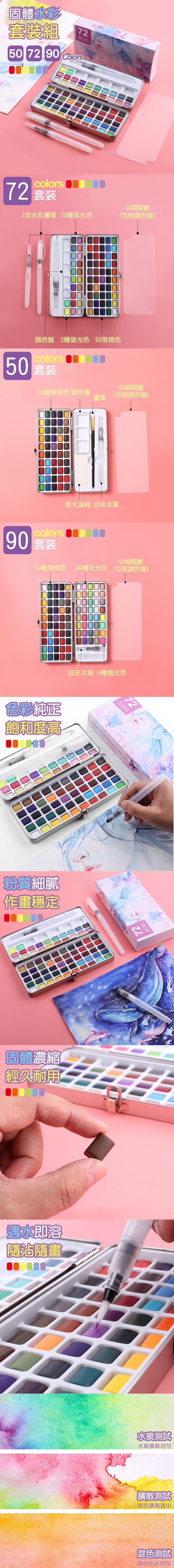 規格:50色 這款水彩套裝組真的是專 為愛畫畫的人設計的呀~ 顏色非常多樣化 非常適合寫生、畫插畫、上色等用途 學生美術課只需要帶這一盒, 就能輕鬆作畫喔 色彩純正 飽和度高 粉質細膩 作畫穩定 固體濃縮 經久耐用 遇水即溶 隨沾隨畫 水彩實測 水痕測試- 水痕擴散均勻 擴散測試- 顏色擴散適中 混色測試- 混色色彩均勻 這款套裝組真的超級實用!!! 愛畫畫的人一定會愛不釋手 趕快失心瘋買起來吧