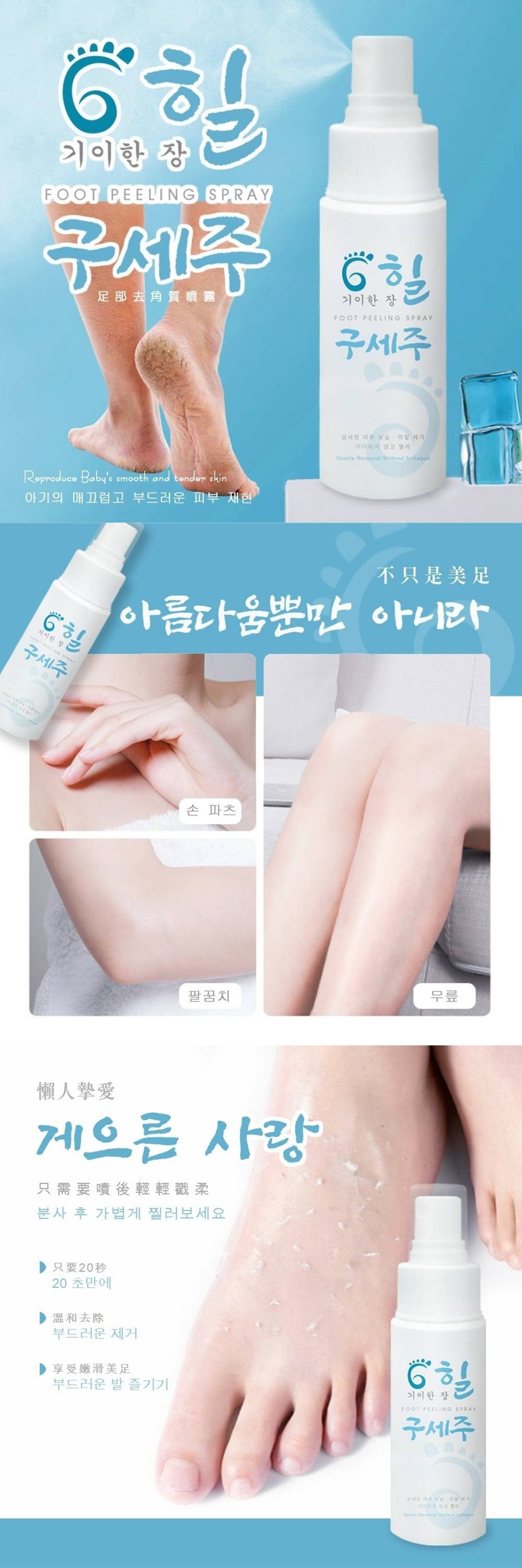 噴在乾燥的腳上後開始搓,再用清水沖洗乾淨即可