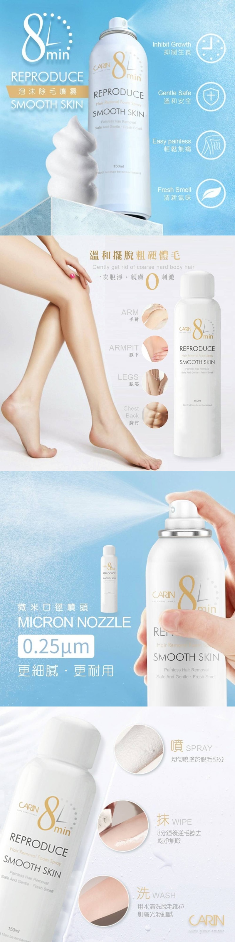 禁止公開上架 刮毛不乾淨,拔毛太費時 熱辣除毛怕痛 網紅最推薦款來了 出口美國爆單款 聽說爆好用的 有效快速除毛,溫和不傷肌膚~ 交給8分鐘搞定的神奇慕斯 泡沫噴霧好噴取 ㄧ噴就能輕松除毛超方便!! 溫和除毛不刺激 含多種精萃萃取,從根部溫和除毛 滋養護膚不傷皮膚 含有多種保濕精萃,脫毛又兼具保濕 氣味清新舒適 成分溫和不刺激 有了這一罐讓夏日除毛變得很easy 容量:150ML 使用方法: 噴在目標部位,停留5~8分鐘 再用衛生紙擦拭即可