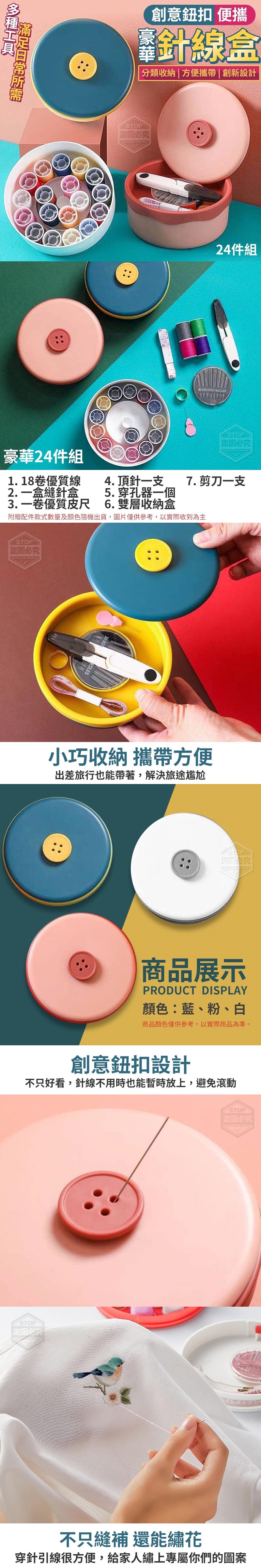 【商品顏色】藍、粉、白 (附贈配件款式數量及顏色隨機出貨 ,圖片僅供參考,以實際收到為主。) 【商品說明】- 超實用的針線盒! 創意鈕扣造型搭配時尚撞色設計 實用又好看,攜帶方便,功能齊全! 豪華24件組內含多種工具 每一件都是必需品, 滿足你的日常所需! 不只縫補 還能繡花 穿針引線很方便, 給家人繡上專屬你們的圖案 小巧收納 攜帶方便 出差旅行也能帶著,解決旅途尷尬 創意鈕扣設計 不只好看,針線不用時也能暫時放上, 避免針線滾動