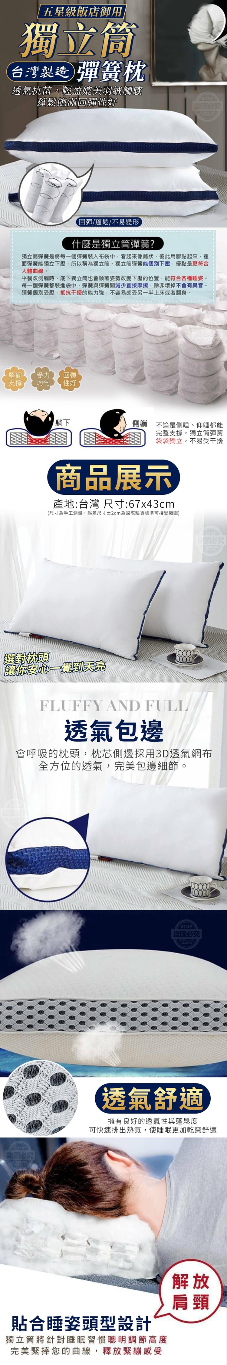 【商品尺寸】-67x43cm(尺寸為手工測量,誤差尺寸±2cm為國際驗貨標準可接受範圍)【商品說明】-你的枕頭常常扁掉嗎?還是躺著總是覺得脖子懸空?一躺下去整個頭都感覺很不飽滿重力下去時總是頭部沒有支撐感仰躺、側躺總是不舒服,無法入睡隔天起床時還落枕了,脖子超級痛一整天精神都不好小編推薦你驚爆飯店專用 舒適彈簧枕千萬別小看它!不但回彈性超好、超透氣睡覺躺下去幾乎就能秒睡,不用喬姿勢獨立筒設計能夠完美的支撐著頭部及頸部壓力我個人超愛這款枕頭,睡眠品質整個變的超好晚上都不需要再翻來翻去獨立筒設計獨立筒能夠完整的服貼頭部曲線有效釋放全身壓力,彈簧內膽服貼又彈性支撐力良好不變形透氣包邊會呼吸的枕頭,枕芯側邊採用3D透氣網布全方位的透氣,完美包邊細節蓬鬆飽滿柔軟性和緩衝性好,環保輕盈媲美羽絨觸感