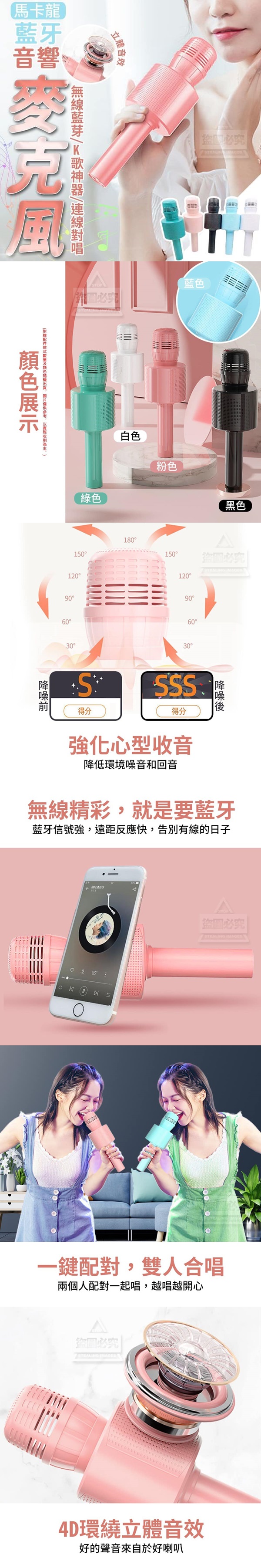 【商品款式】-綠色/白色 /粉色/黑色/藍色 (附贈配件款式數量及顏色隨機出貨, 圖片僅供參考,以實際收到為主。) 【商品說明】- 美聲K歌神器 走到哪唱到哪,全世界都是我的舞台 完美表演就要無"線"精彩 藍牙信號強,遠距反應快, 告別有線的日子 4D環繞立體音效 好的聲音來自於好喇叭 強化心型收音 降低環境噪音和回音 一鍵配對 雙人合唱 兩個人配對一起唱 感情直升溫
