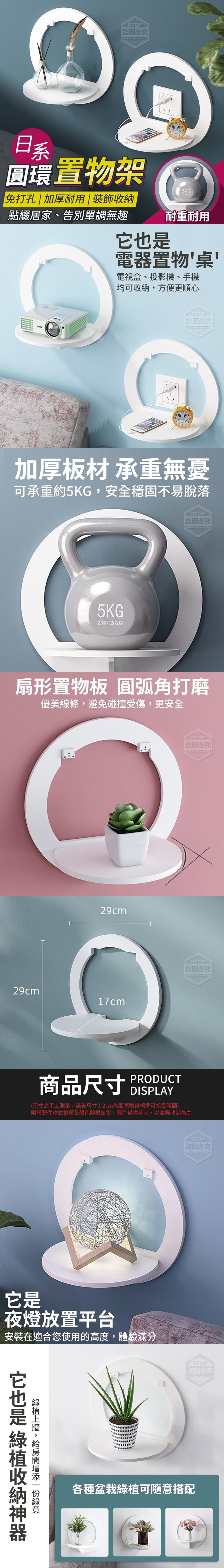 【商品尺寸】-29*29*17cm (尺寸為手工測量,誤差尺寸±2cm 為國際驗貨標準可接受範圍) 【商品說明】- 日系免打孔加厚圓環置物架 時尚好看,免打孔輕鬆安裝 點綴居家告別單調無趣! 扇形置物板 圓弧角打磨 優美線條,避免碰撞受傷更安全 加厚板材,承重無憂 可承重約5KG,安全穩固不易脫落 一物多用好便利 它是夜燈放置平台, 也是綠植收納神器 還是電器置物桌! 電視盒、投影機、手機均可收納 使用方便更順心! >免打孔 >加厚耐用 >裝飾收納