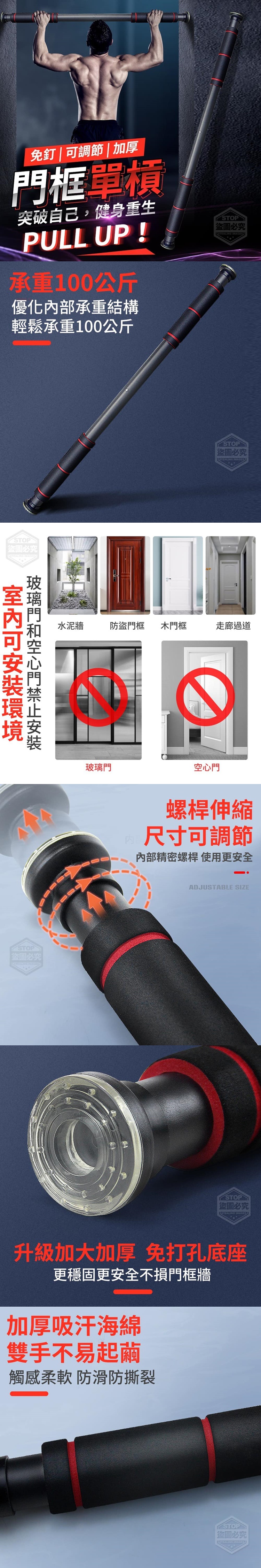 伸縮尺寸60-100cm 【商品說明】- 找不到地方練單槓嗎? 免釘可調節加厚門框單槓 讓你隨時隨地,想練就練! 升級加大加厚免打孔底座 更穩固、更安全、不損門框牆 螺桿伸縮,尺寸可調節 內部精密螺桿用更安全 輕鬆適應多種尺寸的牆、門距 優化內部承重結構,輕鬆承重100公斤 加厚吸汗海綿,雙手不易起繭 觸感柔軟、防滑防撕裂 適用於鍛鍊斜方肌、手臂、腹肌和胸肌 突破自己,健身重生!