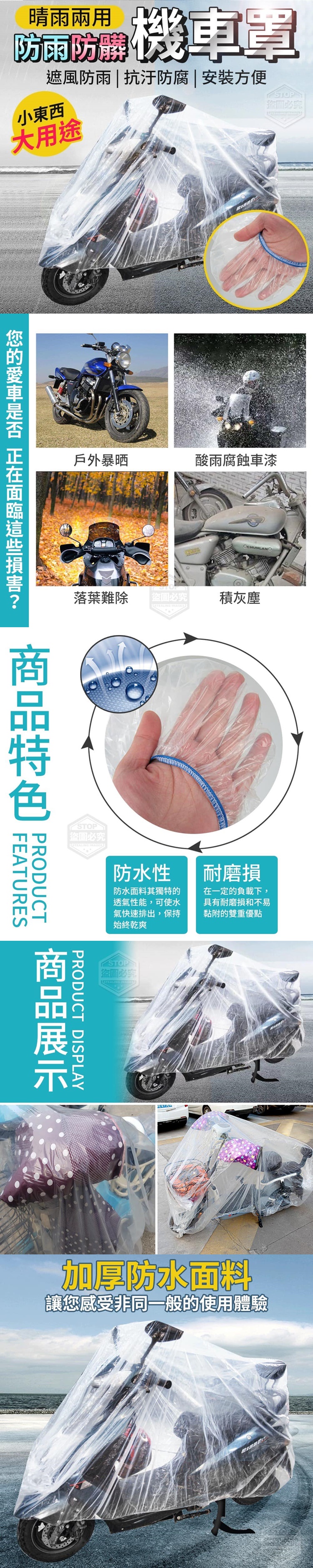 【商品說明】- 戶外暴晒、酸雨腐蝕、落葉難除 您的愛車是否正在面臨這些損害? 晴雨兩用防雨防髒機車罩 加厚防水面料, 讓您感受非同一般的使用體驗 小東西,大用途! 防水性 防水面料其獨特的透氣性能 可使水氣快速排出,保持始終乾爽 耐磨損 在一定的負載下,具有耐磨損 和不易黏附的雙重優點