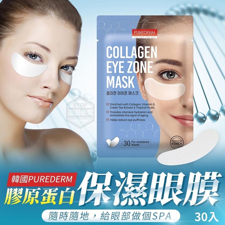 【商品說明】- 眼周皮膚不小心透漏年齡的秘密嗎? 眼周比其他皮膚更薄、更嬌嫩~ 所以更加需要好好保養! 眼妝和每天近兩萬次的眨眼 對眼角、眼尾、皮膚產生影響 容易有鬆弛下垂、眼窩 凹陷、細紋、黒眼圈等問題! 韓國PUREDERM膠原蛋白保濕眼膜 大容量30入,1包可敷15次 讓你隨時隨地,給眼部做個SPA! 膠原蛋白 打造細滑富有彈力眼周的眼膜 舒緩緊緻 集中管理眼周肌膚 預防眼周乾燥產生紋路 多種天然保濕萃取物 玫瑰 綠茶 深層保濕 鎖水修復