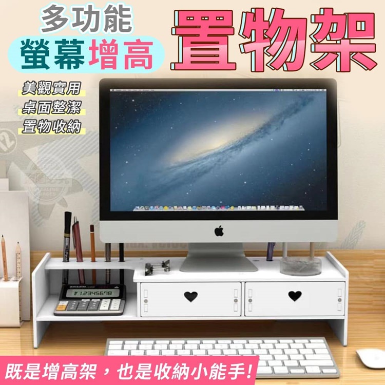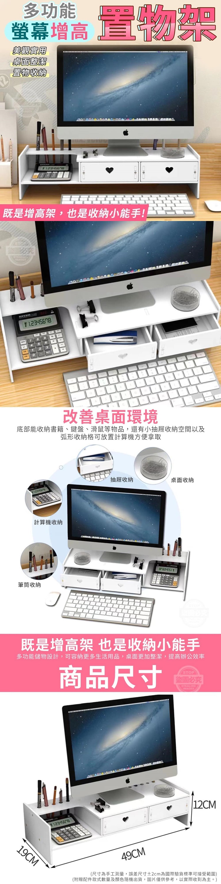 【商品尺寸】-49x19x12cm (尺寸為手工測量, 誤差尺寸±2cm為國際驗貨標準可接受範圍) 【商品說明】- 多功能螢幕增高置物架 既是增高架也是收納小能手 電腦螢幕增高設計 看螢幕時不駝背 減少脊椎的負擔 底部能收納書籍、鍵盤、滑鼠等物品 還有小抽屜收納空間 以及弧形收納格可放置計算機 改善桌面環境,提高辦公效率 計算機收納 抽屜收納 桌面收納 筆筒收納 滿足您各種收納的需求 輕鬆將雜亂的桌面空間 變得乾淨又整潔