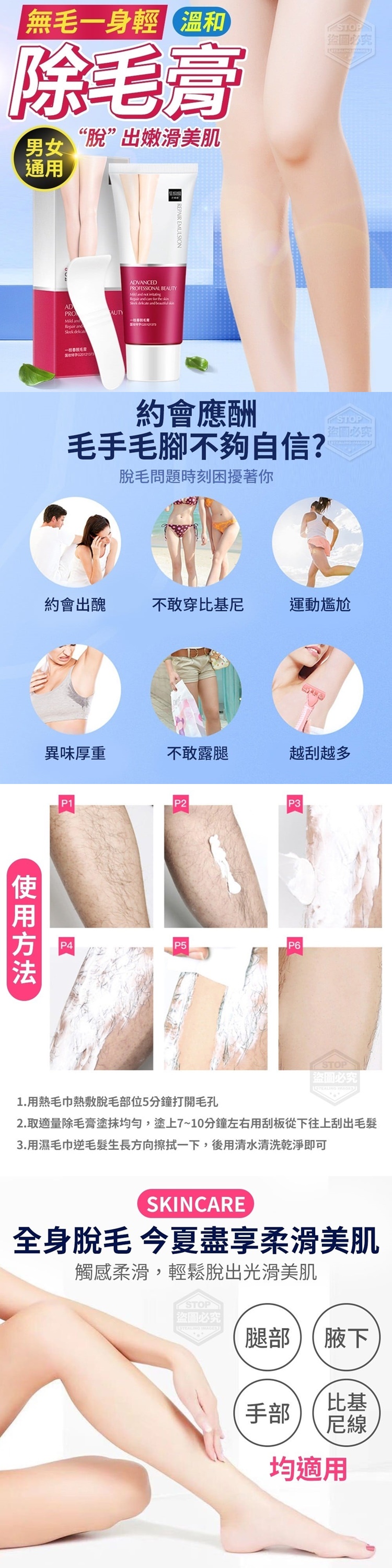 【商品說明】- 約會、應酬、上班 毛手毛腳不夠自信? 除毛問題時刻困擾著你 無毛一身輕溫和除毛膏 腿部、腋下、手部、 比基尼線等全身可用! 腿部使用 告別腿部濃密粗毛, 夏天穿短褲不再尷尬 手部使用 告別手部細長毛,健身、 游泳、上班自在不尷尬 腋下 拒絕腋下茂密硬毛, 約會親密時光不再退縮 今夏盡享柔滑美肌 溫和脫毛+有效抑毛, 輕鬆“脫”出嫩滑美肌 男女通用,一脫到底, 告別粗毛、溫和絲滑 影片僅供參考使用方式 所有配件以實際收到為主