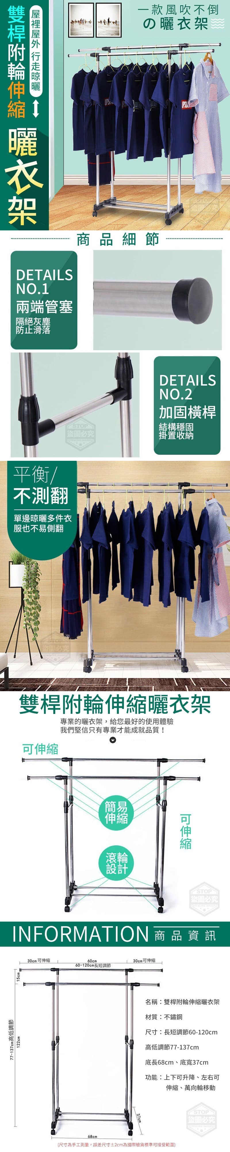 【商品材質】-不鏽鋼 【商品尺寸】長短調節60-120cm、高低調節 77-137cm、底長68cm、底寬37cm (尺寸為手工測量, 誤差尺寸±2cm為國際驗貨標準可接受範圍) 【商品說明】- 上下可升降、左右可伸縮 讓你不彎腰、不費力的把衣服晾好 帶有滾輪使用更方便 不銹鋼堅固耐用,輕鬆承重50KG 底部雙桿可置物、收納曬鞋 一架多用,屋裡屋外、行走晾曬~ 空間大利用,是您居家必備的好幫手!