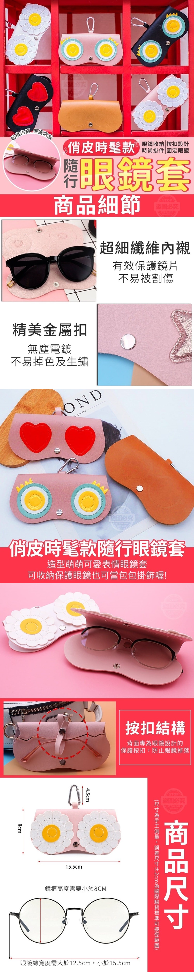 【商品尺寸】-15.5x8cm(不含掛鉤) (尺寸為手工測量, 誤差尺寸±2cm為國際驗貨標準可接受範圍) 【商品款式】-貓眼、大眼怪(黑、粉)、 雛菊(粉、白、藍)、愛心(粉、黑)、咖啡 (附贈配件款式數量及顏色隨機出貨, 圖片僅供參考,以實際收到為主。) 【商品說明】- 常常弄丟找不到眼鏡嗎? 或是沒注意到眼鏡直接坐斷它? 最吸睛的眼鏡保護套