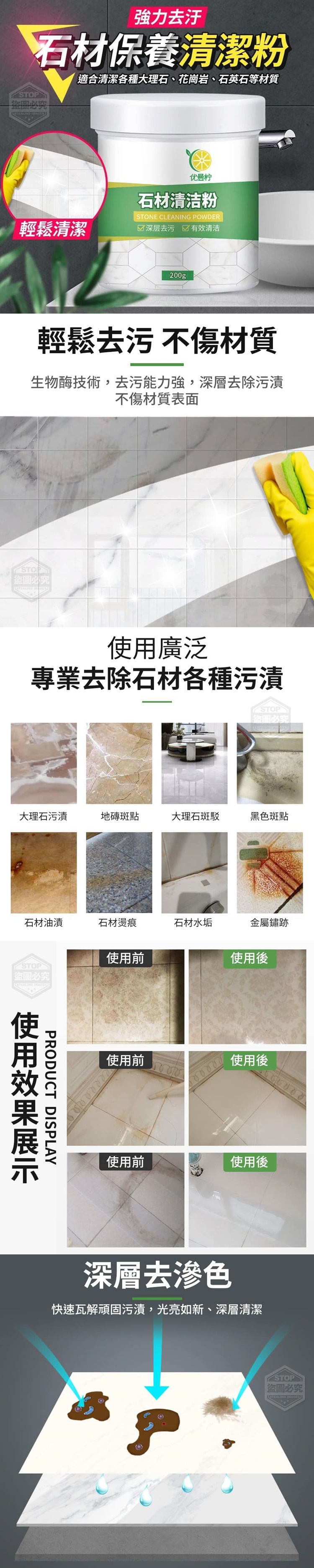 【商品說明】- 石材保養清潔粉,生物酶技術, 去污能力強,深層去除污漬, 不傷材質表面。 適合清潔各種大理石、花崗岩、 石英石等材質,強力去汙、輕鬆清潔! 輕鬆去污 不傷材質 深層去除污漬不傷材質表面 深層去滲色 快速瓦解頑固污漬,光亮如新、深層清潔 中性配方 溫和不刺激 可直接接觸皮膚 溫和安全 護理表面 光亮如新 清潔的同時護理表面, 使石材恢復光亮