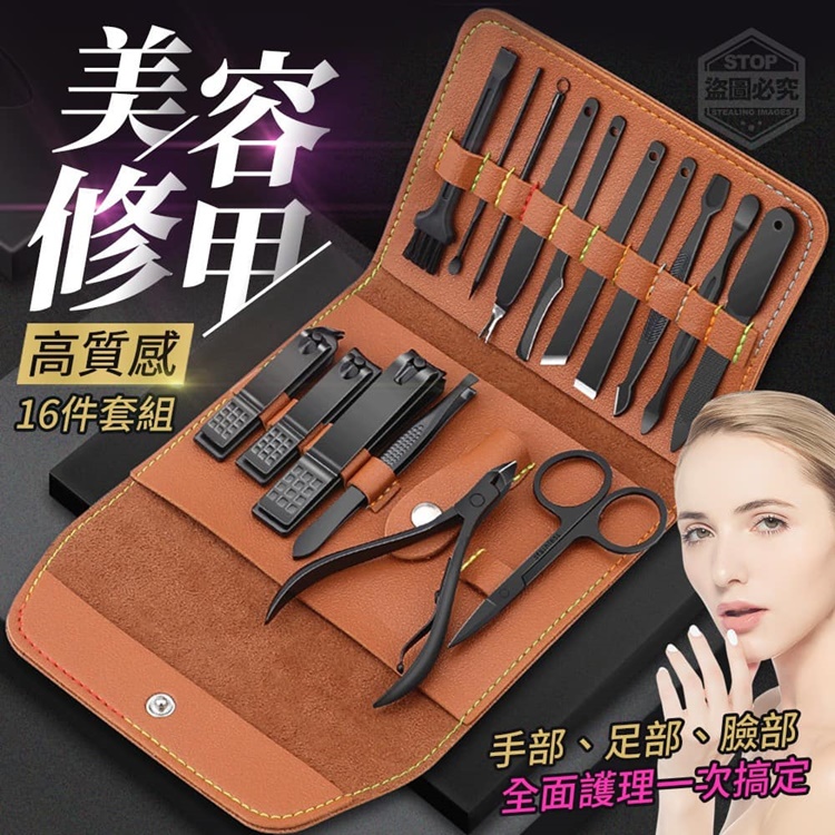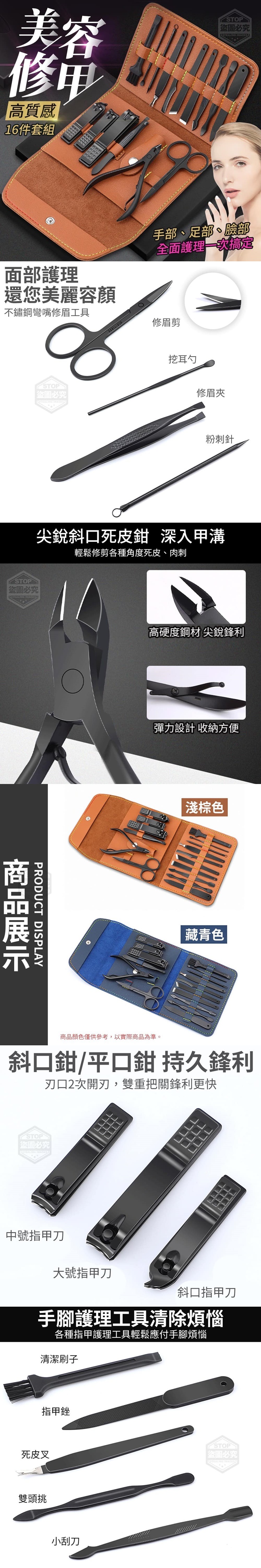 【商品款式】淺棕色、藏青色 (附贈配件款式數量及顏色隨機出貨, 圖片僅供參考,以實際收到為主。) 【商品說明】- 高質感美容修甲16件套組! 手部、足部、臉部 全面護理一次搞定~功能超齊全 斜口鉗/平口鉗 鋒利指甲刀 刃口2次開刃,雙重把關,鋒利更快 輕鬆修剪指甲、各種角度死皮、肉刺 精磨修腳刀快速去死皮 各種指甲護理工具輕鬆應付手腳煩惱 (清潔刷子、指甲銼、 死皮叉、雙頭挑、小刮刀) 面部護理還您美麗容顏 (修眉剪、挖耳勺、修眉夾、粉刺針) ‧持久耐用 ‧精細做工 ‧多種功能